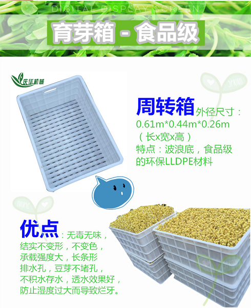 3、豆芽生產(chǎn)流程: 選擇芽豆 →→ 對豆種清洗并做無菌處理 →→ 浸種(適宜水溫) →→ 裝機(jī)(每箱約5斤干豆) →→ 啟動豆芽機(jī),設(shè)定合理參數(shù) →→ 對育芽室做無菌處理 →→ 1天后觀察豆芽生長情況 →→ 2天后觀察豆芽生長情況 →→ 3天后觀察豆芽情況 →→ 4天后收獲豆芽 →→ 豆芽清洗后包裝,上市。 4、豆芽機(jī)制造流程: 5、豆芽機(jī)產(chǎn)品特點(diǎn): 5)減少爛芽現(xiàn)象。豆芽生長的爛芽現(xiàn)象多發(fā)生在培育后的三天左右,由于手工生產(chǎn)豆芽的周期長,易出現(xiàn)爛芽現(xiàn)象,然而采用豆芽機(jī)生產(chǎn),三天左右豆芽已經(jīng)成熟,可以采收食用,不會有爛芽現(xiàn)象發(fā)生。 6、豆芽機(jī)結(jié)構(gòu)特點(diǎn)及功能(可根據(jù)客戶需要訂做): 4)周轉(zhuǎn)箱的外徑尺寸:0.61m*0.44m*0.26m(長寬高),特點(diǎn):波浪底,食品級的環(huán)保LLDPE材料,無味,結(jié)實(shí)不變形,不變色,承載強(qiáng)度大,長條形排水孔,豆芽不堵孔,不積水存水,透水效果好,防止?jié)穸冗^大而導(dǎo)致爛牙。 8、其它產(chǎn)量機(jī)械介紹: 其它機(jī)型介紹: